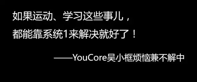 為什么有些人即便在父母的嚴(yán)厲鞭策下考到了牛逼的大學(xué),但在沒(méi)有父母鞭策的環(huán)境下就一蹶不振,肆意妄為了呢,原因很大可能就是因?yàn)樵嫉尿?qū)動(dòng)力并非來(lái)自自己。這與之前YouCore文章講過(guò)的制定目標(biāo)的原理是一樣的(YouCore公眾號(hào)回復(fù)1005獲取),假大空的標(biāo)語(yǔ)是沒(méi)辦法促進(jìn)我們的系統(tǒng)1快速思考做出決策的。